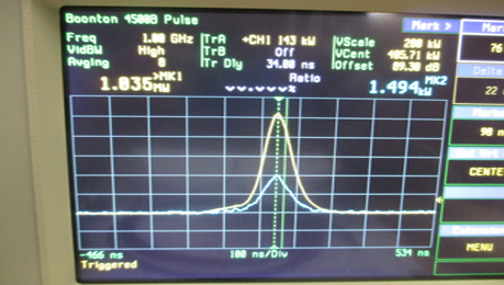 By contract we aren’t allowed to give too many details, but the photos give an idea of what we are doing. It shows a voltage pulse across one tube and the current drawn as it produces a megawatt in just 90nS at 3-5GHz. We are working on even higher power and shorter pulses.